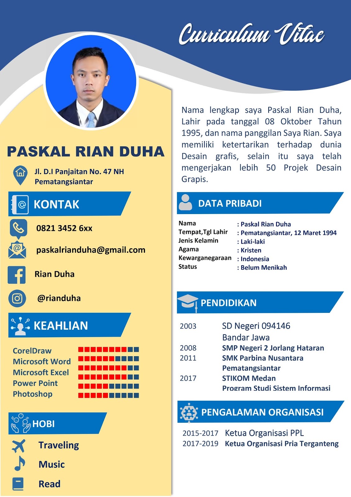 Pada kenyataannya, cv dengan contoh sederhana bukan berarti tidak menarik. Oleh karena itu menulis curriculum vitae yang baik dan menarik akan meningkatkan kesempatan anda dalam mendapatkan pekerjaan idaman. Contoh curriculum vitae kreatif doc. Cv merupakan singkatan dari istilah curriculum vitae yang dalam bahasa inggris yang berarti sebuah dokumen yang berisi riwayat hidup yang pada umumnya di gunakan untuk memberikan informasi tentang data diri dan kemampuan individu. Contoh cv lamaran kerja berikut dapat membantu mu untuk membuat curriculum vitae menarik. Dan lebih tertarik dengan anda. Pengertian cv atau daftar riwayat hidup. Cocok untuk kamu yang fresh graduate, kosong, disertai cara membuat cv untuk pemulda beserta panduan can cohtoh yang baik dan menarik. Sebuah cv akan dilampirkan bersamaan dengan surat lamaran kerja dan dokumen pendukung lainnya untuk diserahkan ke bagian penerimaan karyawan. Layout nya sangat menarik sehingga wajar banyak yang menggunakan desain ini. Kamu tetap bisa membuat cv kamu menarik walaupun tidak terlihat rumit desainnya. Download contoh daftar riwayat hidup (.doc). Anda harus menyertakan data diri anda lebih jelas, asli dan.